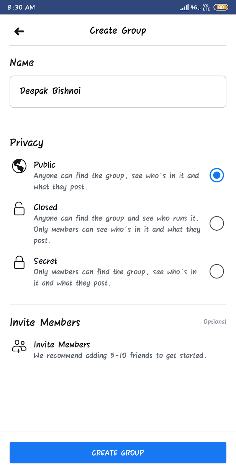 दोस्तों इतना करने के बाद आपके सामने एक नया पेज ओपन होगा यहां आपको तीन ऑप्शन मिलेगी Name , privacy , invite friends, सबसे पहले आपको नेम के अंदर अपना ग्रुप का नाम लिखना है जिस भी नाम से आप ग्रुप बनाना चाहते है दूसरे नंबर पर प्राइवेसी का ऑप्शन है जहां आपको तीन सब ऑप्शन मिलेंगे जिनमें से पहला होगा पब्लिक जिसे चुनकर आप अपने ग्रुप की सभी पोस्ट और अपने ग्रुप को पब्लिक कर सकते हैं जिससे कि आपके ग्रुप को कोई भी देख सकता है और दूसरा ऑप्शन है क्लोज ग्रुप जिसका मतलब यह है कि आपके ग्रुप की पोस्ट को और आपके ग्रुप को वही लोग देख पाएंगे जो कि आपके ग्रुप के मेंबर हैं,इसके अलावा तीसरा ऑप्शन है सीक्रेट ग्रुप इसका मतलब यह है कि आपका ग्रुप दुनिया से छुपा हुआ होगा आपको और आपके मेंबर्स को ही पता होगा कि आपके पास यह ग्रुप है और इसमें क्या पोस्ट हो रहा है कोई अन्य इस ग्रुप को ढूंढ भी नहीं पाएगा, साधारणतया आप स्क्रीनशॉट में दिखाएं अनुसार ऑप्शन चुन सकते हैं और अगले स्टेप पर बढ़ सकते हैं,