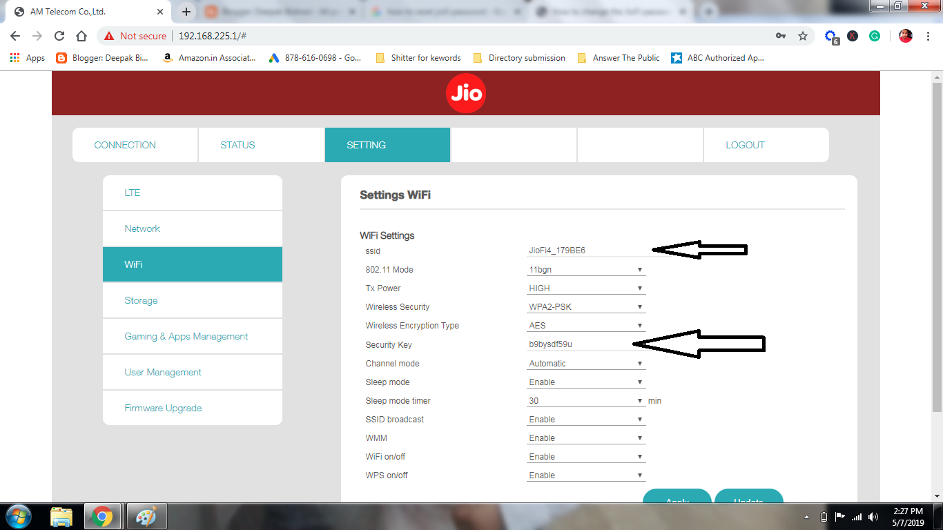 - अब आपके सामने जो पेज ओपन होगा उसमे आपको ssid or security key फील करने का बॉक्स मिल जायेगा वह जो भी ssid or security key आप चाहें वो भर सकेंगे ,ssid or security key एडिट करने के बाद आपको बस apply के बटन पर क्लिक करना है।
